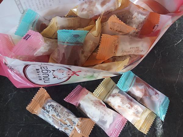 來自諾貝爾牛軋糖,這次購買的是用袋裝的牛軋糖,捧在手掌上感覺蠻有份量的,打開包裝袋後,裡面一個個的牛軋糖好像活潑的小朋友快蹦出來似的